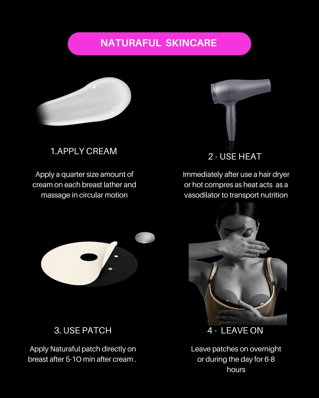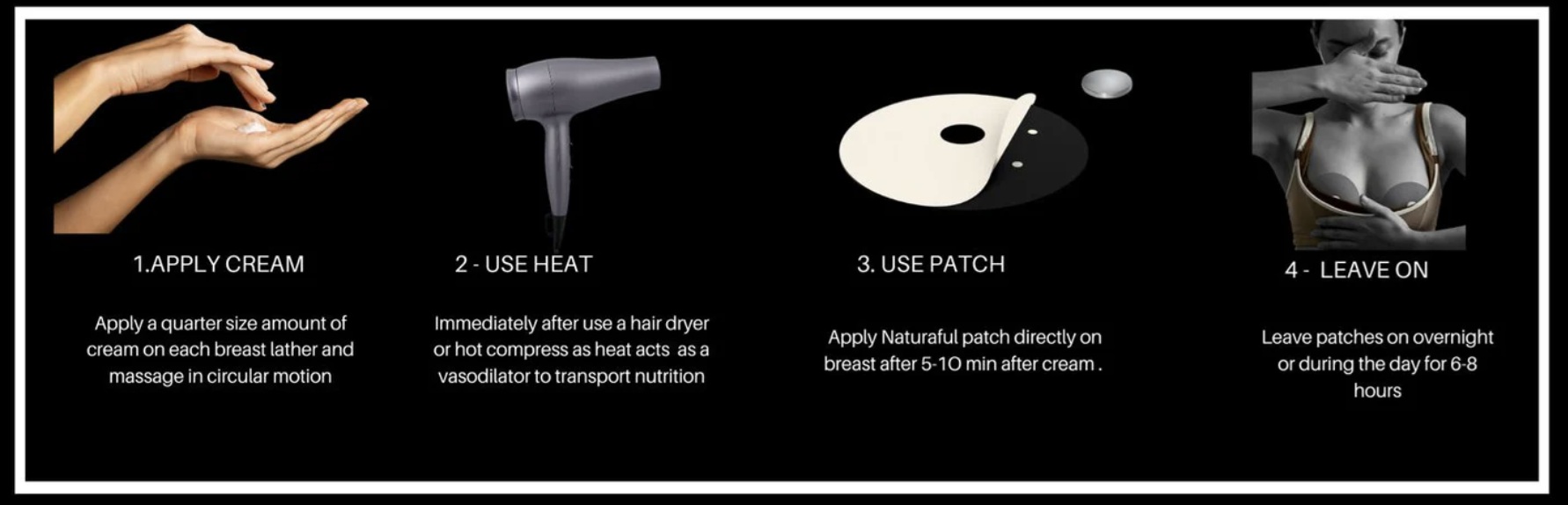 Apply Naturaful patch directly over each breast, you can leave on overnight or wear during the day. Each patch will last approx 6-8 hours and is one time use. Use as needed, many used find best results wearing a patch daily or every other day.
